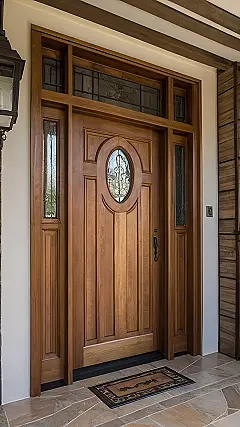 This door isn’t just any old slab of wood; it’s a statement piece! It’s got more character than your favorite TV show, with its cool panes of glass, and rich, warm wood tones. Imagine greeting your friends at this door—they’ll think you live in a castle, or at least that you have amazing taste. Just make sure you have a cool doormat to match, or it’ll be like wearing mismatched socks to a party, and nobody wants that!
