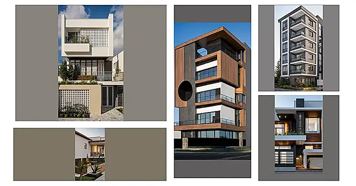 Looking at this awesome building, you can totally tell it’s trying to impress everyone who walks by. It’s like the building put on its best outfit just for the picture! This is basically what ‘front elevation designs’ are all about – how a building faces the street and shows off its style. It’s got those cool wooden panels looking like vertical eyebrows and different layers of stuff happening on each floor, making sure it doesn’t look boring from the curb. Think of it as the building’s selfie game being strong, designed to catch your eye right away.