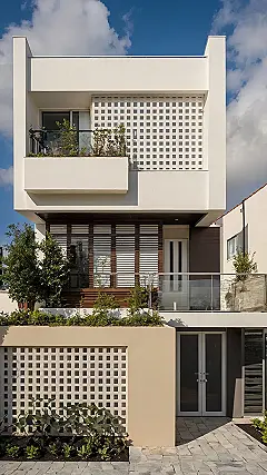 Peep those awesome patterned blocks near the entrance – way cooler than a plain wall, right? And the wooden slats higher up? They look like fancy sunglasses for the house, maybe keeping it cool on a sunny day. Plus, the mini gardens on the balconies are like little green accessories or maybe tiny hats. All these bits and bobs are part of making the front elevation design pop, giving the house its own unique vibe instead of blending in with the crowd. It’s like the house saying, “Hey world, check out my cool style!”
