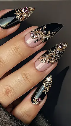 They’re totally black and gorgeous, but the real magic is all the sparkly gold and little gems. You’d probably need a magnifying glass to appreciate all the details, and honestly, who wouldn’t want nails that fancy? It’s the perfect way to make a statement this January, especially if you’re feeling a bit extra fabulous. They’re so glam they might even make your math homework seem more fun (probably not, but a girl can dream, right?).