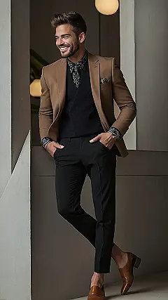 This guy’s outfit is the definition of “perfect gentleman outfits,” but with a seriously cool twist. Forget stuffy old suits – this camel-colored blazer and black pants combo is like a sophisticated superhero costume. It’s all business up top, but totally ready to hit the dance floor (or save the day!). Those brown shoes? They’re the cherry on top of this perfectly put-together sundae. He’s practically radiating effortless style.