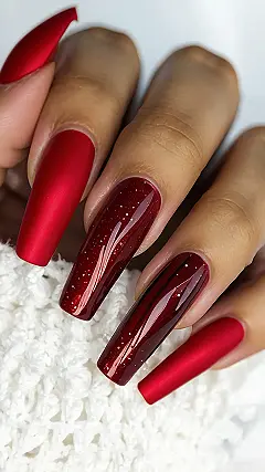 These nails are seriously incredible! Imagine walking into a winter wonderland, but instead of snow, everything’s covered in a gorgeous, rich red. That’s the vibe these nails give off—like a super fancy, sparkly red velvet cupcake. The tiny silver details are like the perfect sprinkles, adding just the right touch of winter magic without being overly fussy. They’re definitely festive enough for holiday parties, but chic enough for everyday wear.