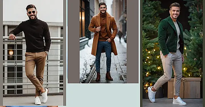 Forget the ugly Christmas sweater! This guy’s rocking a seriously stylish holiday look that’s way more sophisticated than your grandpa’s reindeer pajamas. He’s got the cool, dark turtleneck sweater—perfect for layering—paired with effortlessly chic khaki pants. It’s the kind of outfit that screams “I’m festive, but I also have a life.” Plus, those clean white sneakers? Game changer. He’s ready for Christmas dinner, a family gathering, or even a cozy night in – all while looking ridiculously good.