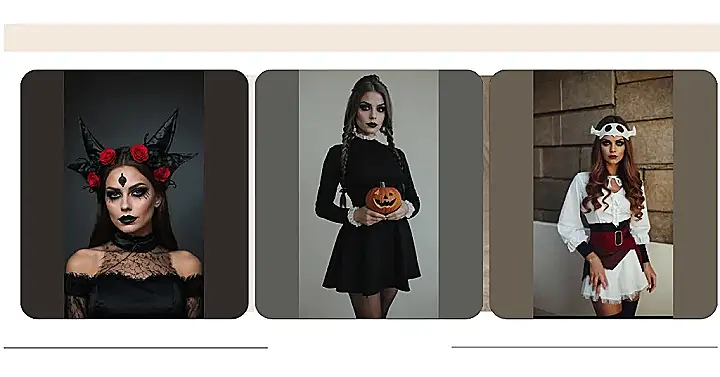 These three friends are rocking some seriously spooky style! They prove that even if you’re scrambling to find a costume, a little creativity can go a long way. The girl on the left has a cute, witchy vibe with her floral crown and dark dress, while the girl in the middle is giving off major “goth queen” energy with her sleek black outfit and dramatic makeup. And let’s not forget the girl on the right, her intricate lace and dark eyes are perfect for a mysterious, maybe even a little scary, persona.