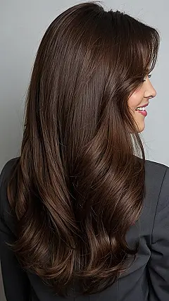 Wow, check out those luscious locks! This person’s hair is like a dark chocolate dream – rich, shiny, and totally enviable. It’s the kind of hair that makes you want to reach out and… well, maybe just admire from afar. It’s so long and wavy, it practically has its own gravitational pull! It’s the perfect example of “dark chocolate brown hair” – a colour that’s sophisticated and effortlessly chic, just like the model.