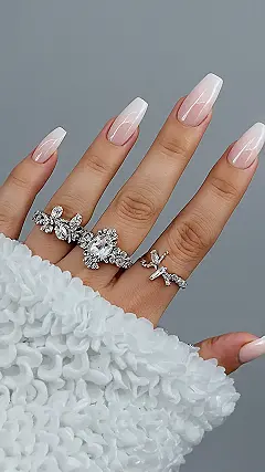 These nails are so fancy, they’re practically royalty! They’ve got that perfect fade going from nude to white, like a classy ombré. Plus, those rings? They’re shaped like bows and flowers, making it look like a garden party happened right on her hand!