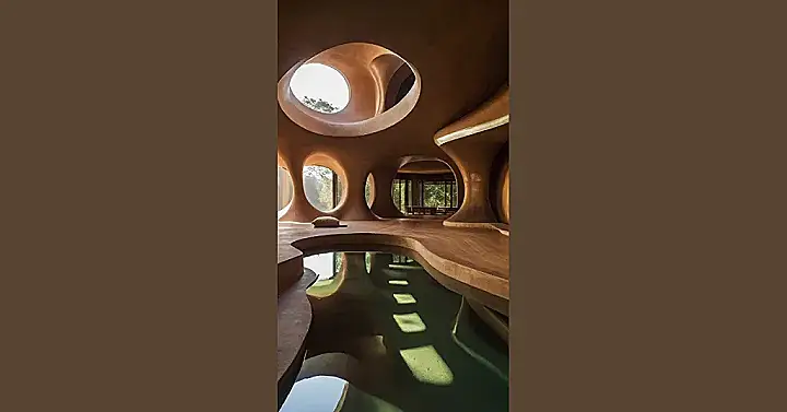 This building looks like something out of a sci-fi movie, right? Imagine living in a house that’s more like a cave, with all these funky round windows letting in the sunshine. It’s like a giant, cozy cocoon! The whole thing is all about “organic architecture,” which means the building’s design is inspired by nature. It’s like the house is growing and changing right before your eyes, with its curvy walls and cool pool that looks like it’s part of the house.