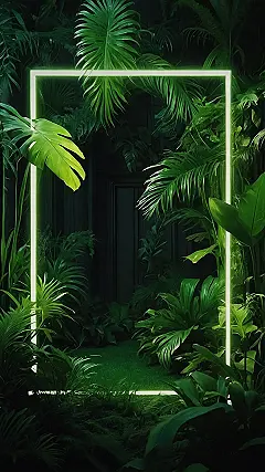 This picture is like a secret garden, but way cooler. It’s all green and leafy, with a super bright neon light making a cool square frame around it. It’s like the jungle’s trying to say, “Hey, look at me!” with this glowing sign. You can practically hear the sounds of the jungle, like the chirping of birds and the rustle of leaves.