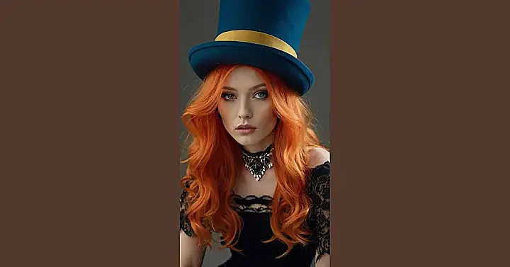 This photo is giving us serious “Mad Hatter” vibes! The model’s fiery red hair and that top hat are just screaming for a tea party with Alice, right? And that dazzling jeweled necklace adds just the right touch of whimsy. It’s almost like she’s ready to jump into a storybook, isn’t it?