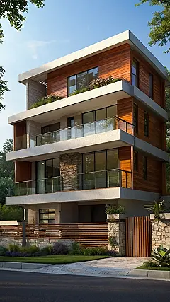 This isn’t your grandma’s suburban house! Forget cookie-cutter homes – this modern marvel is all about sleek lines, stylish wood, and enough balconies to host a small neighborhood block party. Imagine yourself lounging on one of those sweet glass-railed decks, sipping lemonade and pretending you’re on a fancy vacation. It’s the perfect blend of comfy suburban living and seriously cool design – even if it’s a bit taller than what you probably picture when you hear “suburban house.”