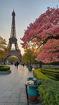 And then you see those incredible trees covered in pink blossoms! Seriously, they look like they belong in a fairy tale and make the whole scene even more dreamy. Being here, with the sun setting behind the iconic tower and all that vibrant green and pink around, just gives off such a cool, relaxed vibe. It reminds you there are places out there that are way more exciting and visually stunning than your bedroom wall or the school cafeteria.