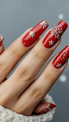 **Paragraph 1:** OMG, check out these nails! They’re like a tiny, sparkly Christmas party happening on someone’s fingertips! Seriously, it’s December, the perfect time to ditch the boring nail polish and go full-on festive. That gorgeous red is totally Christmas-y, and those silver snowflakes? They’re the cherry (or should I say, the snowflake?) on top! I bet they’ll get tons of compliments – maybe even more than that new holiday sweater you’ve been eyeing!