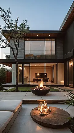 This modern minimalist house is the epitome of cool and calm. With its sleek lines, large windows, and minimalist design, it’s like a breath of fresh air in a world full of clutter. But the real star of the show is the outdoor space. Imagine sitting on those comfy cushions with a warm fire crackling away and the gentle glow of candlelight all around you. It’s the perfect spot to unwind after a long day and enjoy the simple pleasures of life. You could even roast marshmallows!