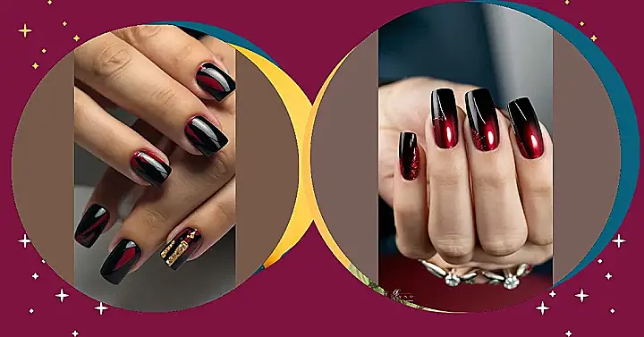 **Paragraph 1:** Forget basic beige! These Thanksgiving nails are anything but boring. Imagine: a super chic, almost spooky, mix of black and deep red, like a stylish little vampire went to a harvest festival. The swirls of color are like fancy autumn leaves, but way cooler. One nail even has a sparkly gold accent – perfect for showing off your best Thanksgiving outfit (and maybe sneaking extra pie).