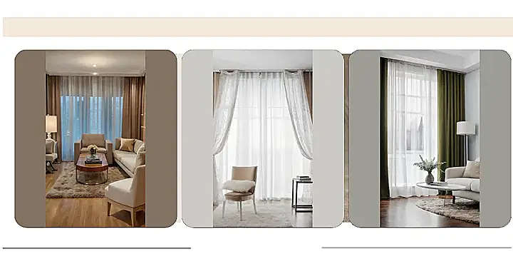The image shows a living room with beautiful curtains, and it’s like looking into a magazine. The curtains are soft and flowy, and they let in just the right amount of light. It makes you want to curl up on the comfy-looking sofa with a good book and a cup of tea.