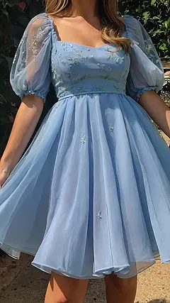 Okay, picture this: Valentine’s Day rolls around, and instead of the usual red overload, you show up in this dreamy, powder-blue frock! It’s got those sweet floral details, floaty fabric, and sleeves that are totally giving off princess vibes. Forget chocolate and roses, this dress is the ultimate statement of self-love or maybe, just maybe, it will catch the eye of that special someone.
