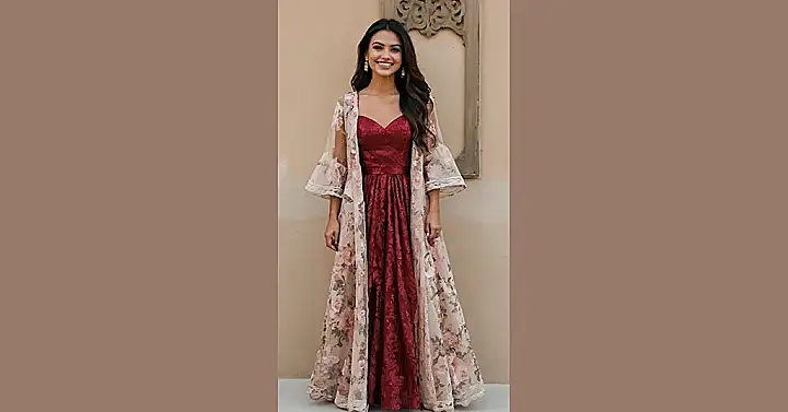 Okay, so Valentine’s Day is coming up, and you’re probably thinking about what to wear. Forget the awkward dinner date outfits and embrace the drama! This frock is like a love letter to fashion itself. We’ve got a gorgeous red dress giving off major “main character” vibes, and a flowy, floral jacket thingy that’s basically saying, “Yeah, I’m a masterpiece, deal with it.” You might need help navigating stairs, but hey, looking this good is worth a little bit of clumsy-chic, right?
