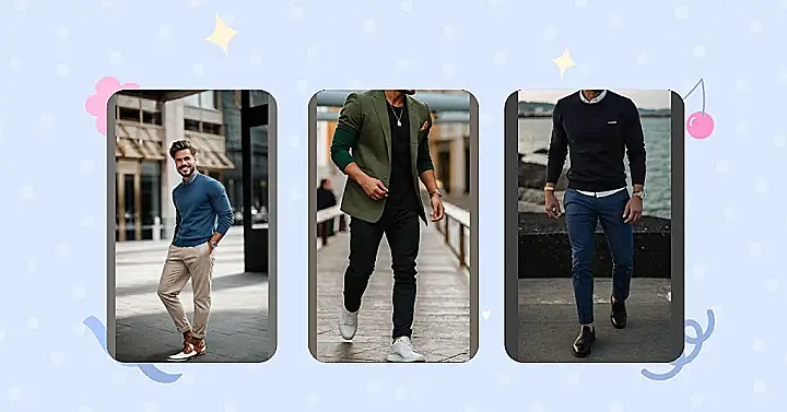 This guy knows how to rock a sweater! He’s got the classic combo of a blue sweater and beige pants – it’s like a fashion equation that always works. The cuffed pants add a bit of coolness, and those shoes are definitely making a statement! He’s got that “I woke up looking this good” vibe, and we’re all a little jealous.