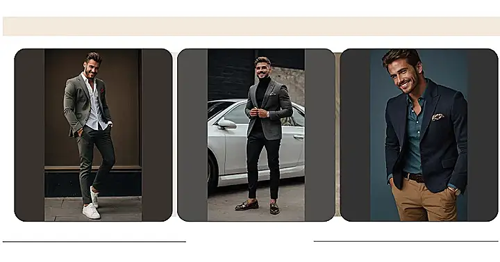 This guy’s totally rocking the “mens fashion blazer” look, right? Forget stuffy suits; this beige blazer is like the superhero of casual chic. It’s saying, “I’m stylish, but I also know how to have fun,” all while paired with dark pants and super comfy-looking white sneakers. It’s the perfect blend of dressed-up and dressed-down— ready for a coffee date or a stroll in the park (maybe even both!). It’s like he’s saying, “I can be sophisticated AND chill – pick your adventure!”