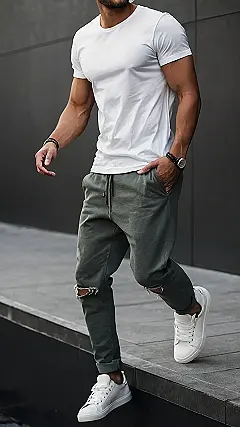 This guy’s got the “I’m cool and comfortable” vibe going on with his casual t-shirt and sweatpants outfit. Think of it like your favorite comfy pajamas, but way more stylish! He’s rocking a simple, light-colored tee and matching pants – it’s a classic combo that never goes out of style. Plus, his chill vibe is totally contagious! Just picture yourself walking down the street looking effortlessly cool like him, ready to take on the world in style!