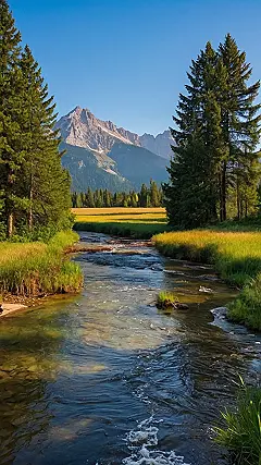 This landscape is so real, it’s practically jumping off the screen and offering you a lemonade! The trees are showing off their majestic poses, while the little stream meanders through the grass like it’s on a sightseeing tour. Even the sun is joining the party, beaming down like it’s the VIP of this natural rave.