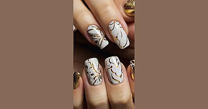 These nails are seriously next-level! Imagine showing up to your holiday party with these beauties – everyone will be asking where you got them done. They’re like a fancy white chocolate bar, dipped in sparkly gold, with some seriously intricate designs. Forget reindeer, these nails are the *real* highlight of the Christmas season. So much sparkle, it’s practically blinding! You’ll be the shiniest star at any winter gathering.