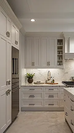 These cabinets look like they’re straight out of a fancy cooking show, but don’t let that intimidate you! The white color and simple design are super versatile, kind of like wearing jeans—they go with everything. You can easily change up the vibe of your kitchen by swapping out the hardware (that’s the handles and knobs, duh!), like trading those sleek black pulls for something shiny and gold if you’re feeling extra.
