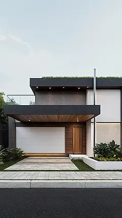 Seriously though, this design is brilliant. The mix of the warm wood and the clean white walls is super stylish, like something you’d see in a magazine. Plus, that little bit of green landscaping adds a fresh, welcoming touch—perfect for showing off your awesome car and making a great first impression on everyone who visits. It’s modern, it’s functional, and it’s seriously cool!