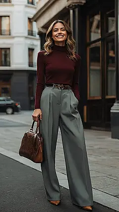This outfit is total boss babe energy, right? Forget frumpy, this look proves that middle-aged women’s fashion is anything but boring. The woman in the picture is rocking a stylish burgundy turtleneck – perfect for layering – with some seriously cool wide-leg pants. It’s like comfy pajamas met a power suit and had the most fabulous baby ever! And that bag? It’s the perfect accessory to carry all the adulting essentials (and maybe a sneaky chocolate bar).