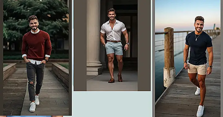 This guy’s outfit is the definition of chill. A comfy cream-colored t-shirt and some tan shorts – it’s like he just stepped out of a summer breeze. He’s rocking that effortlessly cool look that’s perfect for hanging out with friends, grabbing ice cream, or even just strolling through the park. No fancy stuff, just simple, stylish, and super comfortable. It’s the kind of outfit that screams “I woke up like this, but better!”