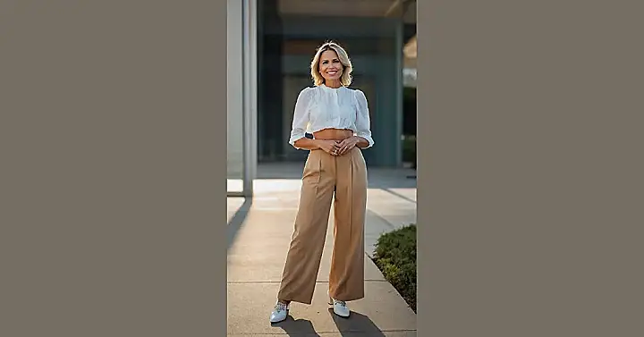The best part? They look comfy without sacrificing style. Think of them as sophisticated sweatpants—you can still binge-watch your favorite shows on the couch in them. She’s even rocking sneakers, proving that you don’t need heels to look amazing. This outfit is the perfect mix of “I’m put-together” and “I can still chase after my kids if I need to”.