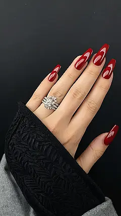 Those nails are seriously striking! That dark wine red is like the color of a vampire’s favorite juice box (if vampires drank juice boxes, which is a totally valid question!). They’re long and pointy, perfect for accidentally poking someone if they ask for a manicure selfie—just kidding (mostly)! The ring matches the red perfectly. They look so elegant, but also ready to conquer the world, one perfectly painted nail at a time.