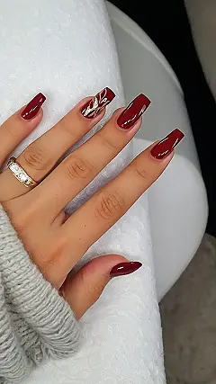 These nails are seriously giving us major “dark wine red” vibes! Imagine sipping a delicious glass of red wine while showing off these gorgeous, sophisticated claws. That fancy gold design on one nail is like a little party on your fingertip – it’s adding some extra sparkle to an already stunning look. It’s the perfect mix of grown-up glamour and playful pizzazz!