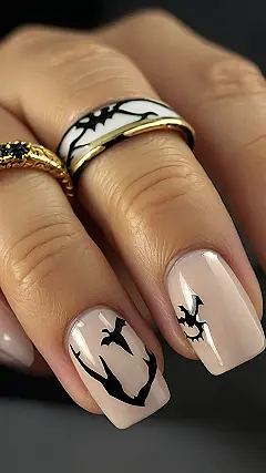These nails are giving us major Halloween vibes! They’re the perfect mix of spooky and chic. We love how the little bats are flying around on the nude nails – it’s like they’re ready to swoop in and steal some candy! And the ring with the bat design is a seriously cool touch. This is a great look for anyone who wants to show off their spooky side without going overboard.