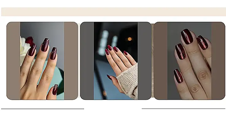 Seriously though, these nails are super stylish. It’s like someone took a fancy red wine and splashed it all over your fingers, then sprinkled some gold dust on top for extra sparkle. They’d look amazing with any outfit, from your favorite jeans to a dressy party outfit. You’ll be turning heads everywhere you go, and you’ll have the coolest nails in school for sure!