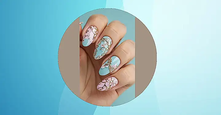 Look at these nails! They’re basically tiny, fancy gardens living on someone’s fingertips, ready for the official arrival of May. With those soft pink and cool blue vibes split right down the middle, it’s like they captured a spring sunset and dunked it in a bucket of awesome. Add the super detailed gold vines wrapping around and all that sparkling bling like tiny morning dew drops, and you’ve got nails so extra they probably need their own tiny bodyguards. Seriously, these May nails are dressed to impress and look ready to attend the fanciest garden party of the season.
