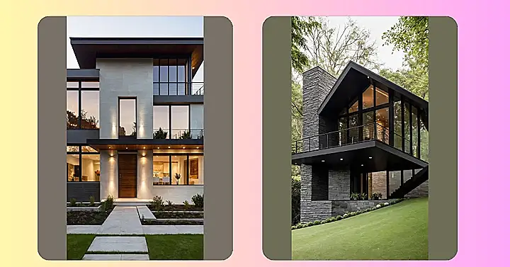 Check out this place! It’s like someone played Jenga with giant, cool rocks and then added a ton of windows to make sure you never miss the sunset (or the delivery guy with pizza). This isn’t just four walls and a roof; it’s house architecture design showing off. You can practically hear the architects high-fiving each other after drawing this up, probably saying things like, “Let’s put some shiny glass railings on a balcony because… why not?” It looks so fancy, you’d almost feel underdressed walking up to the door in your sweatpants.