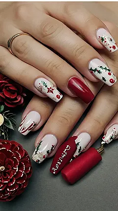 These nails are seriously festive! Imagine showing up to your Christmas party with these beauties – everyone would be asking where you got them done. It’s like a mini Christmas tree on each finger, but way more chic than your grandma’s tree topper. The mix of creamy white with the pops of red and gold is totally classy, just like those fancy Christmas decorations you see in magazines. Plus, that little red nail with “Reindeer” on it? Pure genius! It’s the perfect touch of fun without being too goofy.