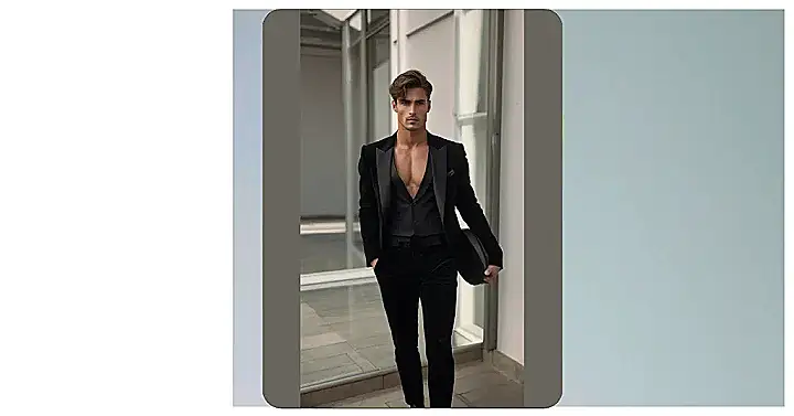 This guy looks super sharp in his all-black suit! He’s got the whole tuxedo thing going on, which is perfect for a fancy party or even a night out on the town. You know what they say, a good suit makes you feel like you can do anything! He even has a fancy watch on to make sure he’s always on time. Maybe he’s going to a special event or a big date – either way, he’s definitely dressed to impress!