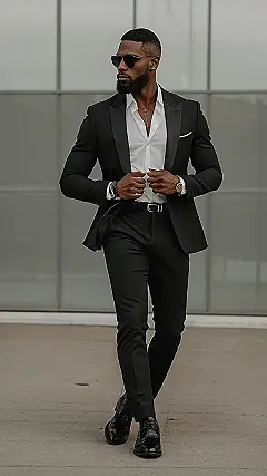 This guy’s got the ultimate “men in black” look down pat! He’s rocking a sleek black suit that would make even Agent J jealous. The crisp lines and sharp tailoring make him look like he just walked out of a fashion magazine. Don’t even get me started on those shoes! They’re like the cherry on top of a perfectly iced birthday cake – totally finishing the look. He’s definitely ready to take on any party or special occasion in style.