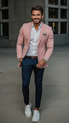 Going to a party and want to stand out (in a good way)? Then check out this look! It is a cool combo of a pink blazer, a crisp white shirt, and some sleek navy pants. It shows you are ready to party, but also means business, maybe not really business but that sounds good right?. Plus, the white sneakers give it a touch of “I’m too cool to care”.