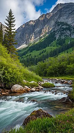 Trying to get a picture of a mountain landscape like this is basically a battle between you and nature, and let’s be real, nature usually wins. You trek out there with your camera, ready to capture the majestic peaks and rushing rivers, but the river is probably just trying to race past your lens, and the mountain is so tall it makes you feel like you need a drone or maybe a really tall ladder just to fit it all in the frame. You spend ages finding the perfect spot among the rocks, trying not to fall in, while the scenery just sits there looking perfect without even trying.