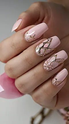 Those nails are seriously next-level! The light pink color is totally cute, like bubblegum but way more sophisticated. Plus, the gold designs are like tiny, elegant fences built right on your nails. I wonder if they could keep my chips safe from my little brother?