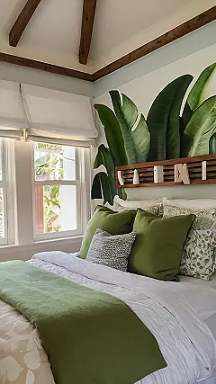 So, your room needs some serious help? Check out this bed situation! It’s like someone raided a jungle and then decided to make a really comfy fort out of it. From the giant plant wallpaper that could totally hide a monkey (don’t worry, probably not) to the green-on-green-on-green pillows, it’s a whole vibe. If you ever wanted to feel like you’re sleeping in a tropical rainforest, but without all the bugs and humidity, this is totally the way to do it.