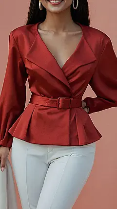 This lady is rocking a fierce red outfit that’s totally making a statement. Her sleek red blazer with a cinched-in waist makes her look like she’s ready to take on the world! The white pants add a touch of class and contrast, making her look like a total fashionista. She looks confident and ready to own any room she walks into.