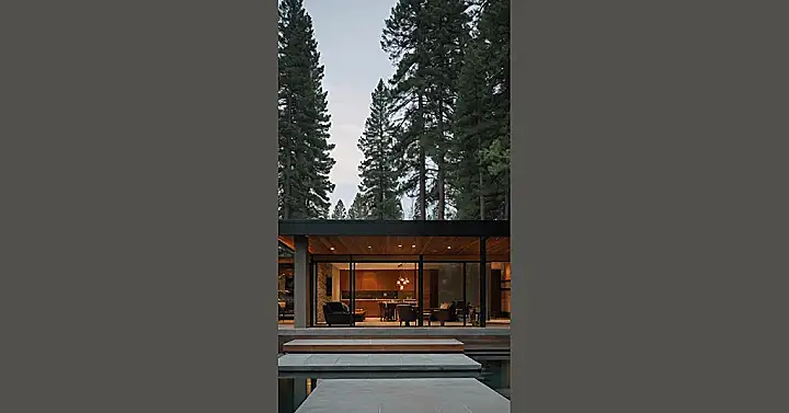This house is like a modern ranch house, but way fancier. It’s got all the cool features you’d expect, like a big open space and a cool roof, but with a twist! It’s got a big, beautiful window that’s practically a wall of glass. You can almost see the forest coming in to give you a high-five. It’s like the house is saying, “Come on in, the trees and I are waiting!”