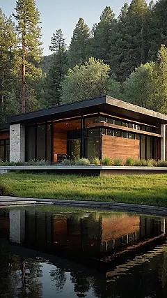 This house is like a cool, calm oasis tucked away in the woods! It’s got all the sleek modern touches – think big windows and a flat roof – but it’s also got that cozy ranch house vibe with its wood paneling and earthy colors. The best part? It’s got a little pond in front, which makes it look super fancy, like something out of a magazine.