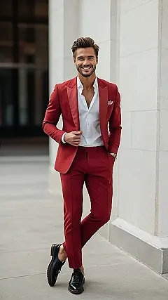 This guy’s rocking a seriously snazzy men’s red suit! It’s like a superhero costume, but instead of fighting crime, he’s probably just conquering the world of amazing style. That shade of red is bold, it’s confident, and let’s be honest, it’s way more fun than your average boring grey suit. He looks like he’s ready for a fancy party, a red-carpet event, or maybe even a very stylish game of hide-and-seek (because who wouldn’t notice him in that suit?).