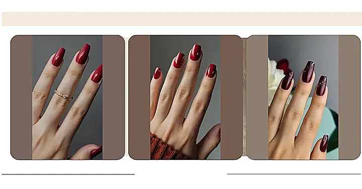 This picture shows some seriously cool nails! That deep red color is totally giving off autumn vibes, which is perfect for when the weather gets chilly. It looks like the person in the picture is also rocking a super fancy ring with a big sparkly stone. It’s like a princess ring, but maybe a little more modern. Maybe they’re getting ready for a fancy event, or maybe they just want to feel extra glam! Either way, they’re definitely making a statement with their bold nails and dazzling jewelry.