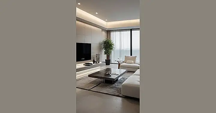 This room is seriously stylish! Imagine walking into this super-clean, modern living room. The walls are like a giant, creamy-colored canvas, super smooth and sleek. The TV is mounted perfectly, like a piece of art, and the low-slung furniture makes the whole space feel open and airy. It’s all very “grown-up” but in a really comfortable, inviting way. You could totally imagine chilling out here with friends, watching a movie, or just hanging out. It’s the kind of place where you’d feel instantly relaxed and ready to binge-watch your favorite show (after you finished admiring the decor, of course!).
